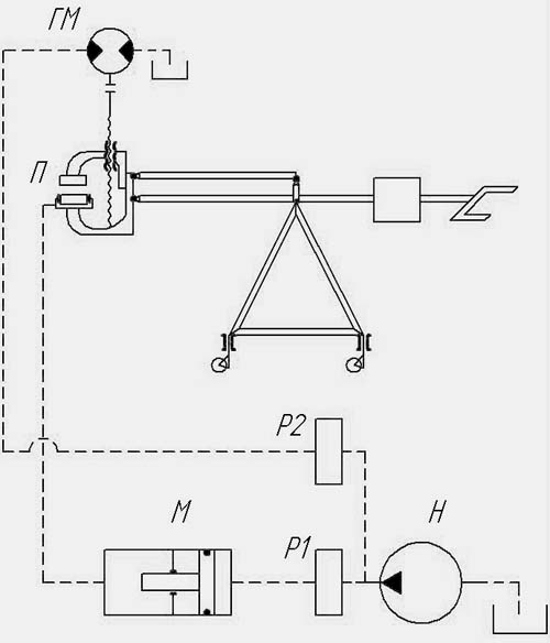 Привод клепальной установки–гидравлический. Он представляет собой насос Н с рабочим давлением 32 МПа (320 кгс/см²). Распределители Р1 и Р2 управляют соответственно плунжером П клепания и гидромотором ГМ перемещения губок. Давление от насоса Н посредством мультипликатора М преобразуется в рабочее давление 80 МПа (800 кгс/см²) поступающее на плунжер П клепания.