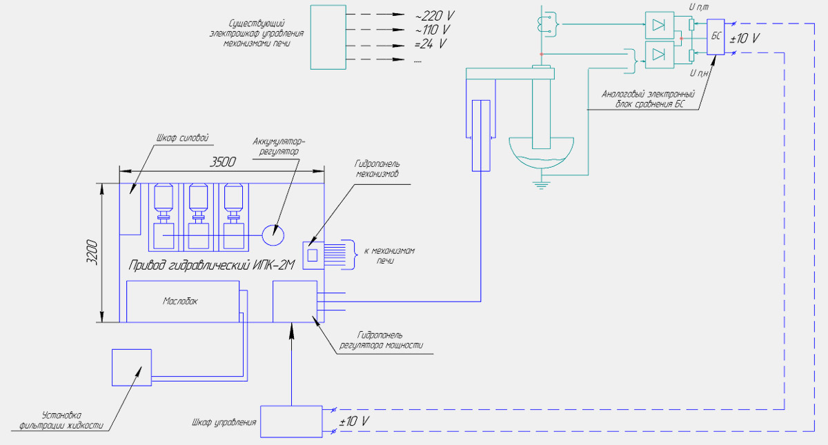 Если ваша ДСП имеет характеристики хуже чем указанные в таблице из ГОСТ 27729-88 , а также Ваш расход электродов выше 3 кг на тонну выплавляемой стали, то у нас есть обоюдная тема для общения. Ниже показана принципиальная схема электрогидравлического регулятора мощности дуговой сталеплавильной печи, заказав который, вы одновременно получаете гарантированный экономический эффект, оговоренный ещё на стадии формирования технического задания.