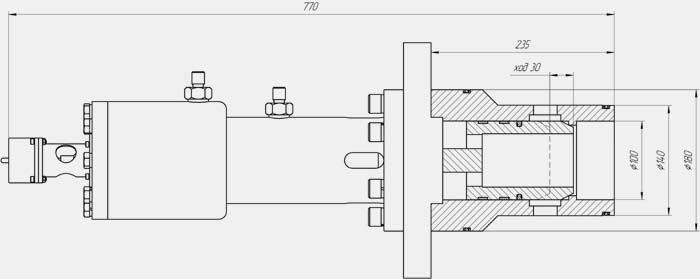 Работает сервоклапан следующим образом. Электрический сигнал – задание, поступает на шаговый двигатель, который осуществляет заданное число оборотов. Каждый оборот перемещает управляющий золотник на величину шага резьбы, а так как в обороте шагового двигателя 200 безошибочных шагов, то точность позиционирования управляющего золотника микронная. С такой же высокой точностью перемещается выходное звено и клапан. Усилие на управляющем золотнике несколько килограмм, но благодаря гидроусилителю (он же следящая система с гидропитанием от источника давления 6,3МПа работающего на минеральном масле) усилие на выходном звене, соединенном с клапаном составляет 20 тс, а потому клапан весьма устойчив к внешним возмущениям.